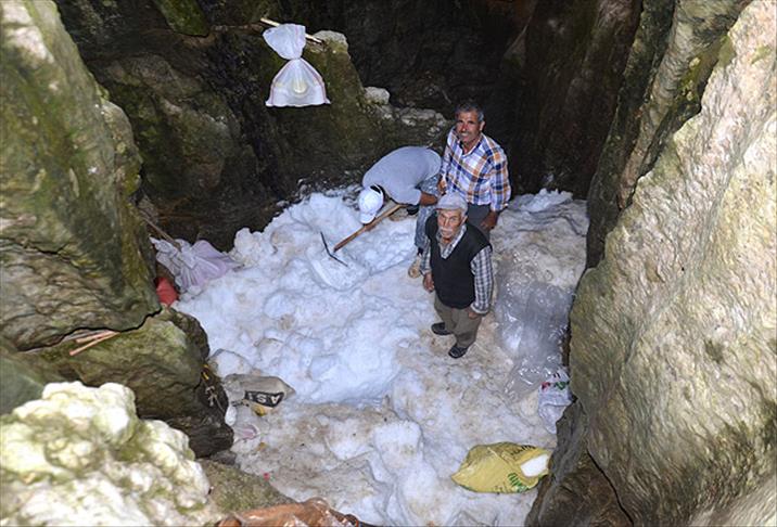 Antalya'nın Akseki ilçesinde Toros Dağları'nın zirvesindeki 50 metrelik obruk, yiyeceklerin saklandığı "soğuk hava deposu" gibi kullanılırken, buradan çıkarılan kar da eritilerek içme suyu olarak tüketiliyor.